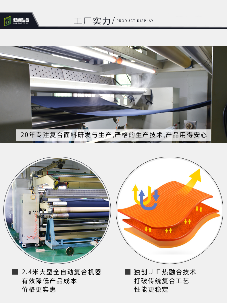复合工艺:JF热融合技术,贴合牢固、环保无味、柔软耐水洗